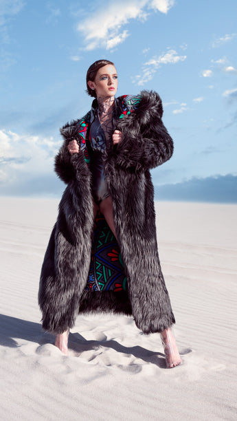 " As a frequent festival-goer, I've finally found the perfect coat for occasions like Africa Burn. This long, heavy weight coat isn't just about staying warm — it's a full-blown experience. I absolutely love the cool exterior pattern and the luxurious fur on the inside, not to mention it's reversible! Plus, the large hood can fit two, making it both practical and a fun conversation starter. It's truly a unique piece that stands out in any crowd. I wholeheartedly recommend this coat to anyone seeking a perfect blend of style, comfort, and festival-ready functionality."