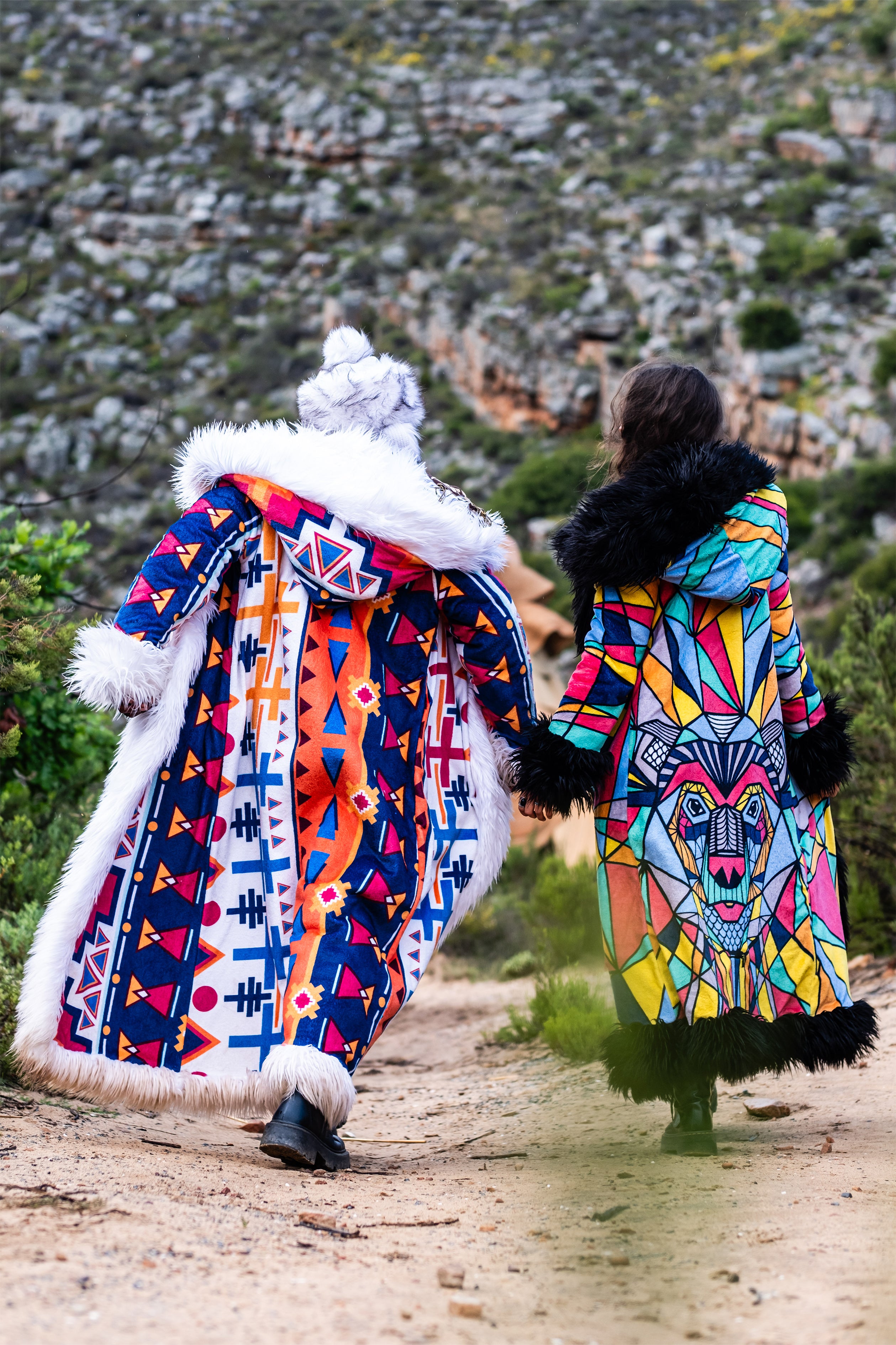 " As a frequent festival-goer, I've finally found the perfect coat for occasions like Africa Burn. This long, heavy weight coat isn't just about staying warm — it's a full-blown experience. I absolutely love the cool exterior pattern and the luxurious fur on the inside, not to mention it's reversible! Plus, the large hood can fit two, making it both practical and a fun conversation starter. It's truly a unique piece that stands out in any crowd. I wholeheartedly recommend this coat to anyone seeking a perfect blend of style, comfort, and festival-ready functionality."